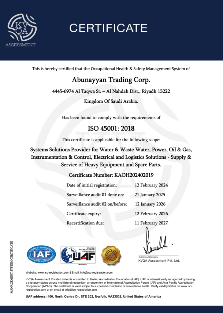 These certifications are a testament to the collective effort of our exceptional team. By adhering to internationally recognized standards, Abunayyan Trading Corp. ensures continued operational excellence and a lasting positive impact on our clients and the environment.
